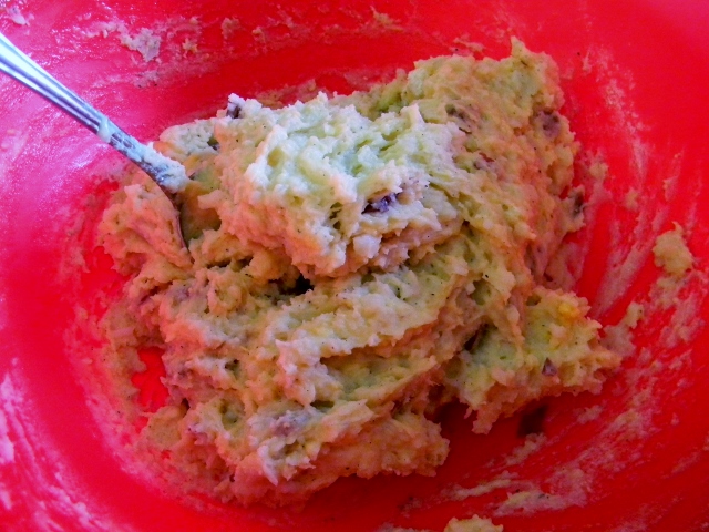 Start with your left over mashies and add flour, eggs, salt, pepper, and finely chopped onion.